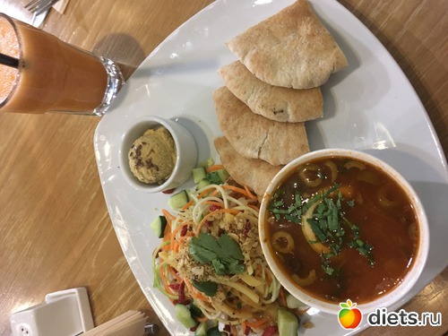 Вот как классно, например. Солянка с подкопченным тофу, овощной салат, хумус и лепешки. Вкусно!