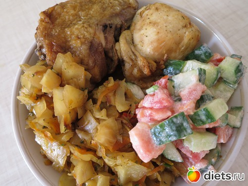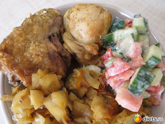 обед - курочка в духовке + тушеная капуста + салатик из помидорки с огурцом