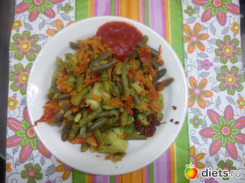 Обед – стручковая фасоль + брокколи тушеные (ещё добавила помидоры, морковь, лук). Про фасоль стручковую уже писала, что это некрахмалистый овощ, длинные зеленые стручки. Достаточно много скушала на обед.