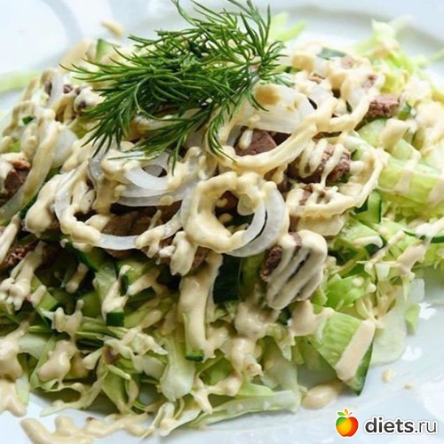 Выкладываем слоями капуста, огурцы, сердечки, немного лука, заправляем.