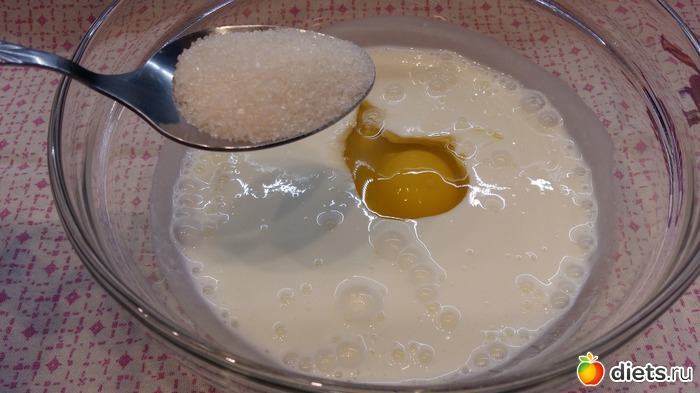 В теплый кефир (он должен быть комнатной температуры), его нужно 300 грамм, добавляю одно яйцо, пару столовых ложек сахара, половинку чайной ложечки соли и 1\4 чайной ложечки соды