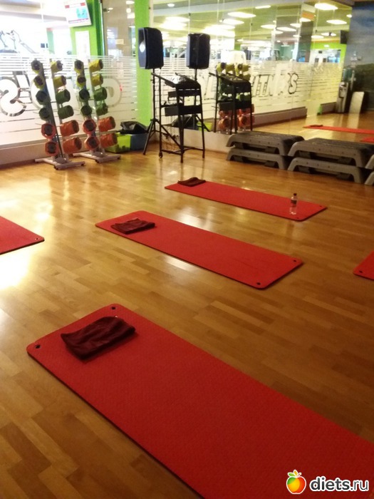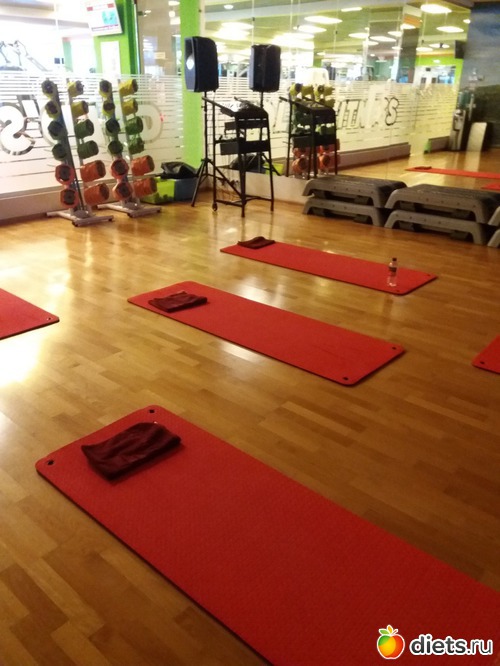 Сегодня был аншлаг. Хорошо, что я рано пришла, т.к. розовых ковриков для йоги и пилатеса на всех не хватило. Не хватило и других, тёмно зеленых, поменьше - их повытаскивали из других залов и даже из тренажерки, у качков отняли)))) И те, кто опаздал, занимались на маленьких для фитнеса))) Хорошо, что размеры зала позволяют вместить столько народу! Пилатес, если все упры дедать правильно и дышать правильно, огого как мышцы нагружает! Супер вещь!
