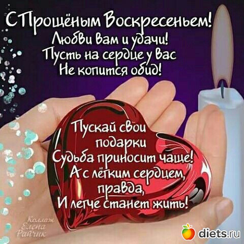 В Прощеное воскресенье я искренне прошу меня за всё простить. Прошу оставить всё плохое в прошлом, прошу не вспоминать о ссорах и обидах, прошу не сожалеть и не грустить. Желаю, чтобы в сердце жило счастье, чтобы душа была полна гармонии и вдохновения, чтобы любимые и дорогие сердцу люди всегда были рядом с Вами. Простите меня