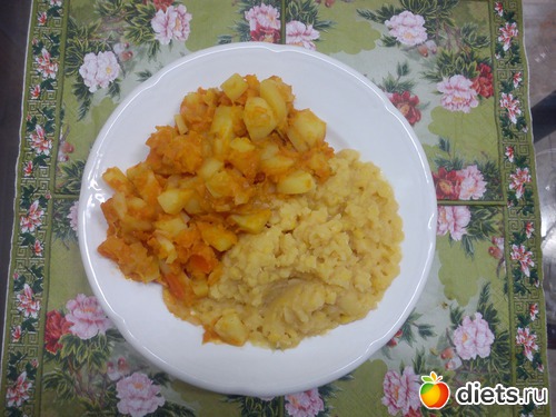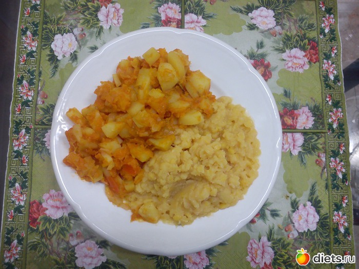 Обед - тушеные овощи (картофель, тыква, перец, чили, морковь, лук) салат из свеклы, гороховое пюре. Порция большая, поела от души.