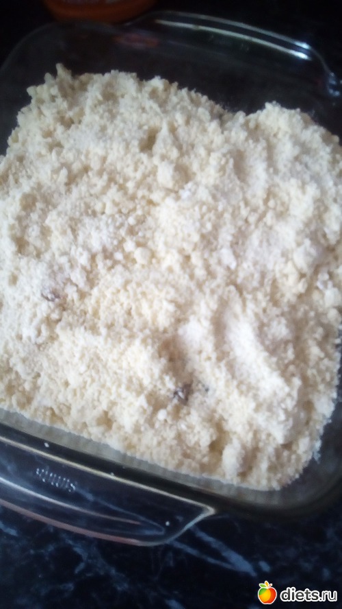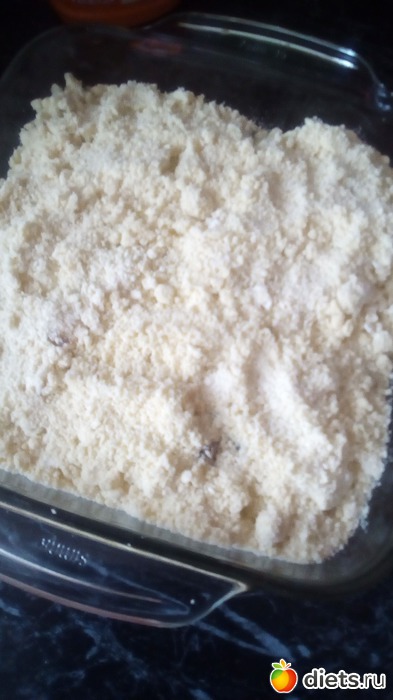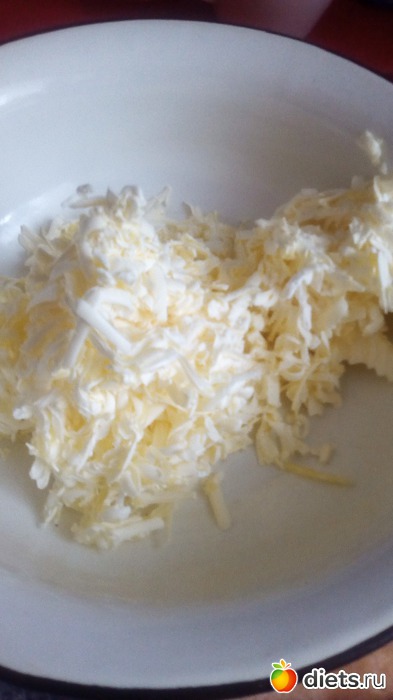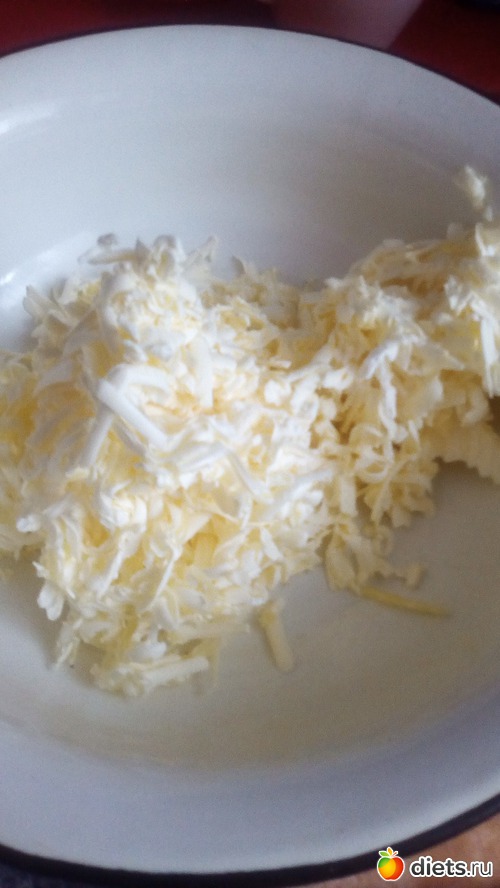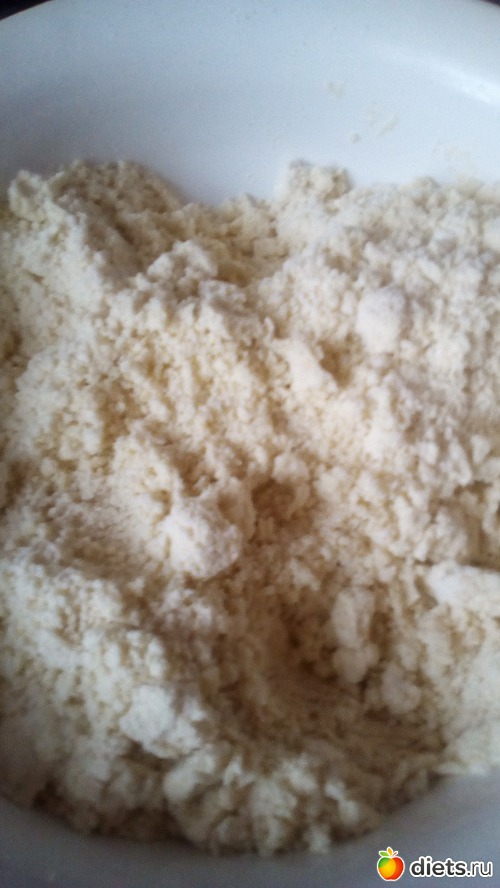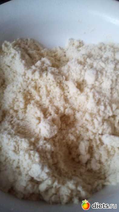 Достаем пачку масла(маргарина) из морозилки-так будет проще его натереть на терке! Натрем на терке и добавим сюда муку с разрыхлителем. У меня потребовалось 200г пшеничной +120г кукурузной муки. Начинаем наше тесто перетирать руками в крошку. Не спешите с добавлением всего количества муки! Тесто должно получиться хорошо рассыпающимся.