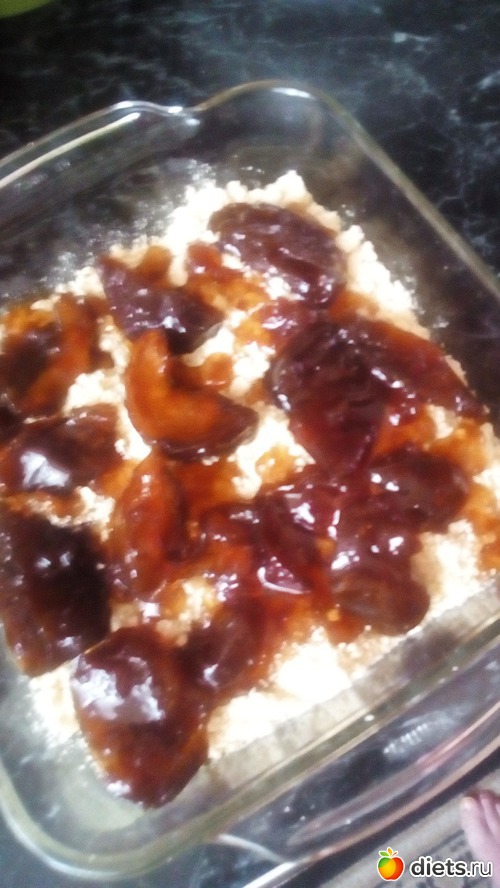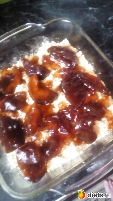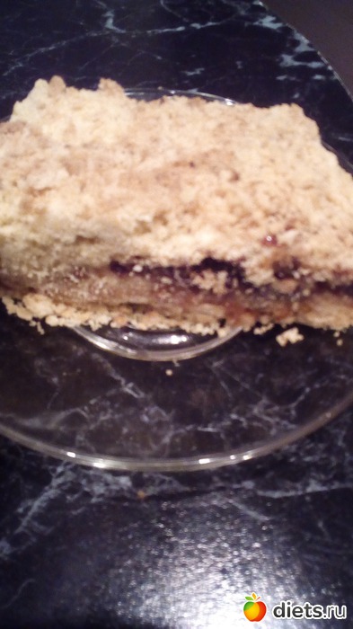 Насыпаем 1/2 теста(можно и трехслойным сделать пирог-тогда 1/3 теста), затем начинка. Это может быть варенье, ягоды, творог, мясо, овощи-фантазируйте! И заканчиваем-слоем теста.