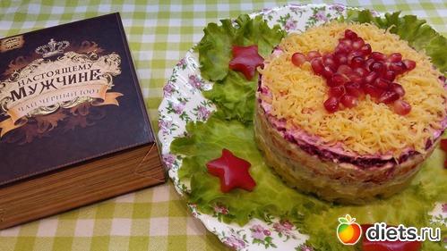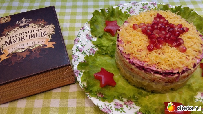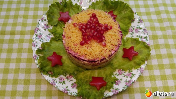 Да самый обычный,слоями картофель, мясо отварное, морковь, сыр, свекла, сверху еще сыром припорошила, майонезом с чесноком промазан и украсила.