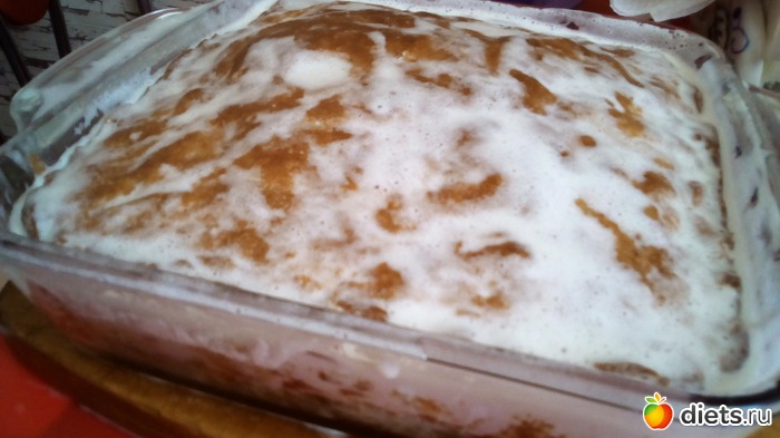 Еще горячую ее заливаем сметанным кремом! Даем пропитаться пару часов и приступаем к чаепитию!
