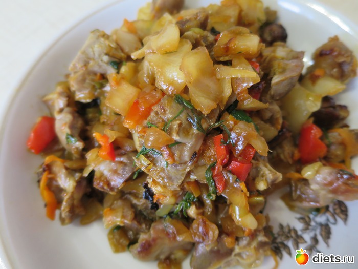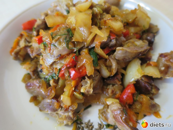 Обед - куриные желудочки ( отварила, потом потушила с капустой, перцем, луком, морковкой и зеленью) объядение получилось, лучше чем в прошлый раз