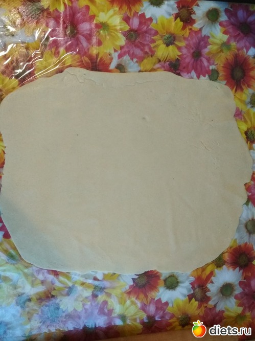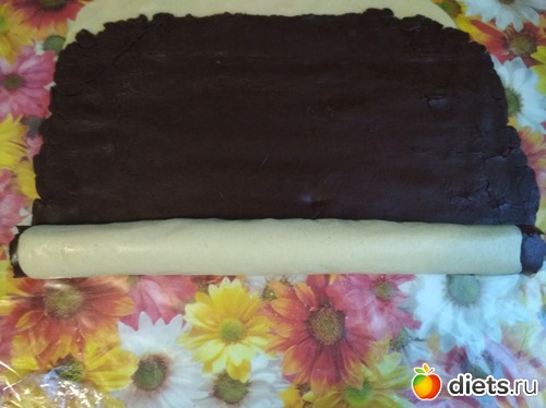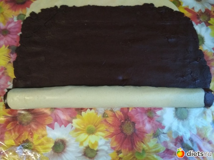 С помощью пленки, на которой лежит тесто сворачиваем рулетик