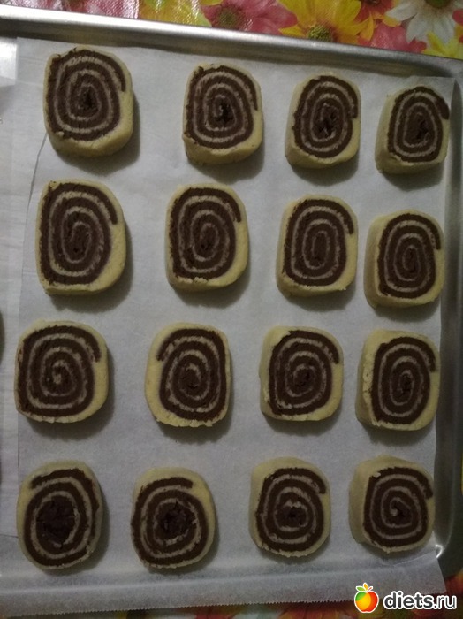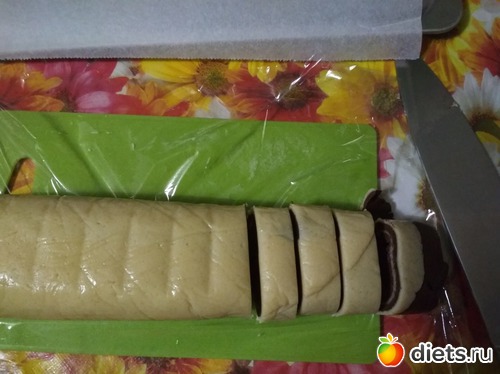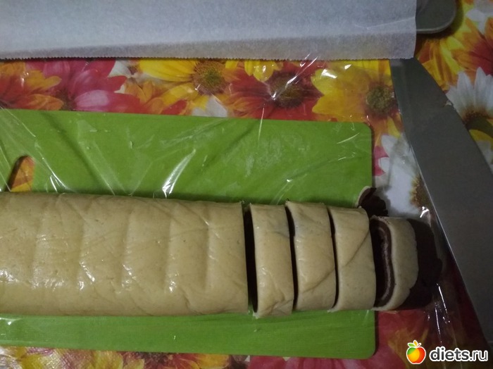 Включаем духовку на 200’для разогрева. Достаем рулет и нарезаем печеньки толщиной 1,5см