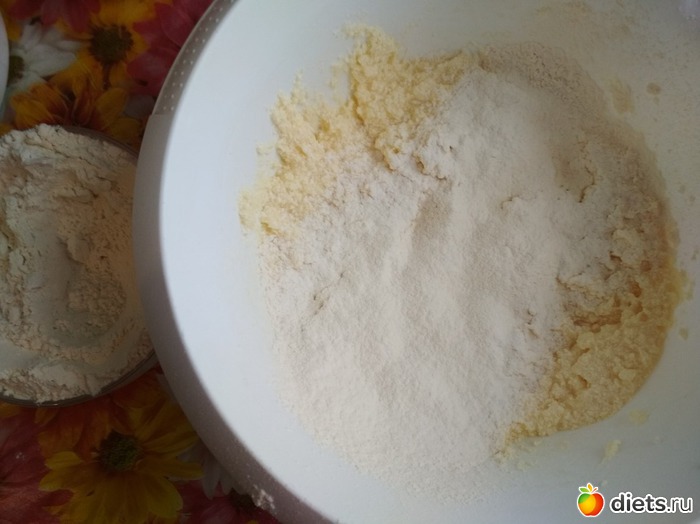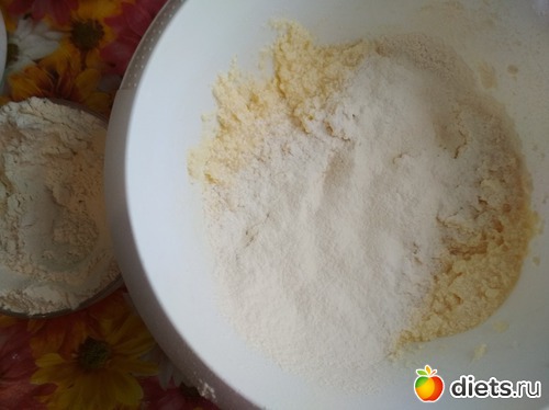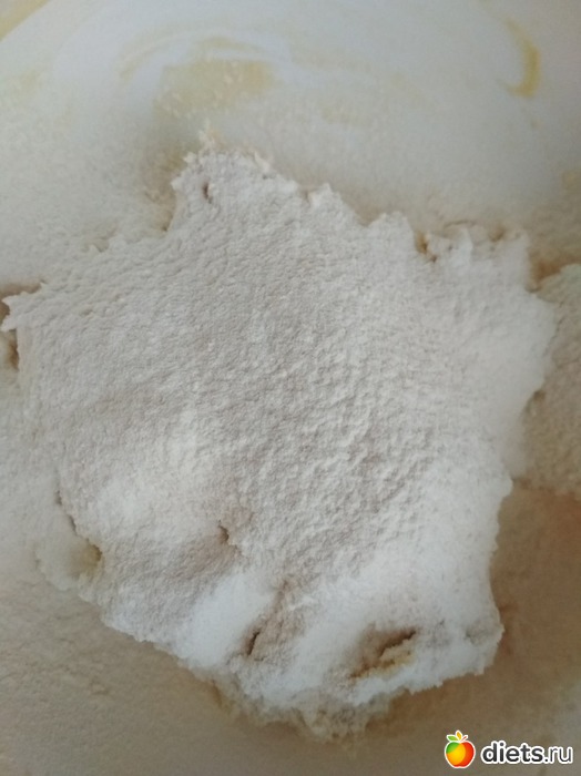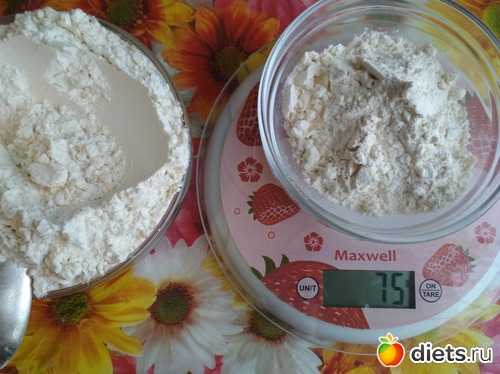 Перемешиваем. От основной части муки(450г)отнимаем75 г