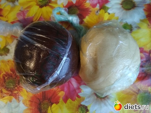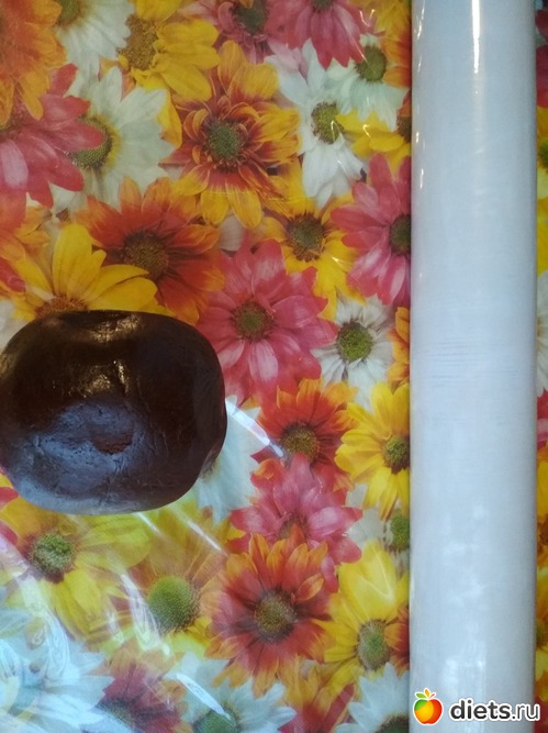 И убираем в холодильник на 20-30минут. Нам понадобится пищевая пленка. Достаем по одному колобку и раскатываем на пленке в виде прямоугольника