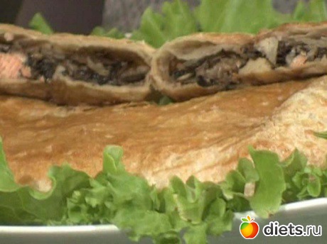 Готовое бездрожжевое тесто - 1 упаковка. Начинка: луковица - 2 шт., шампиньоны - 0,5 кг, отварной рис - 2 стакана, филе рыбы (семга или форель) - 600 г, соль, перец - по вкусу.