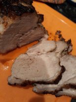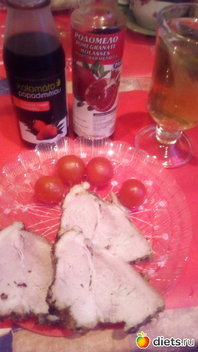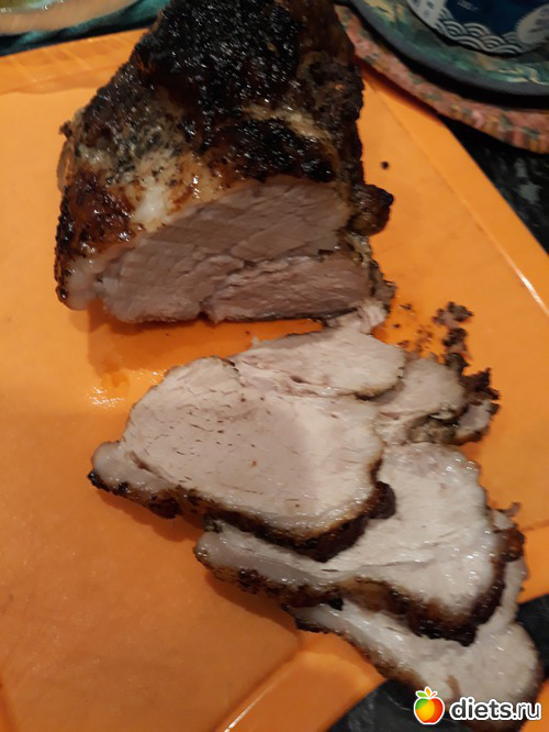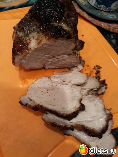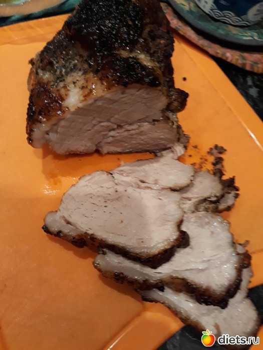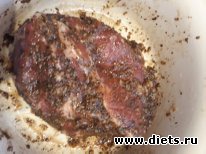 Запеченное мясо-в рукаве, замаринованное в специях, базилике, в соевом соусе и с можжевеловыми ягодами.