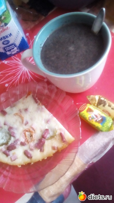 -пицца на сковороде+2 конфетки+молотый кофе, заваренный в чашке