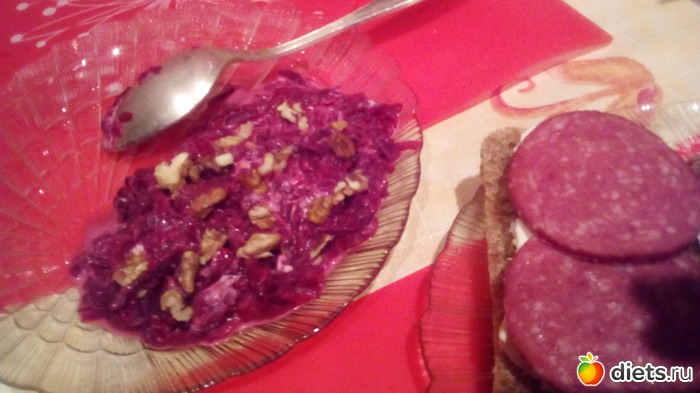 -Свекла с грецкими орехами с домашним йогуртом+бутерброды с сервелатом+чай с лимоном