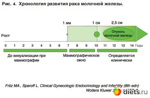 Аргумент третий. Если мы обратим свое внимание на хронологию роста опухоли от 1 клетки до 1мм опухоль растет 7 лет, от 1 мм до 1 см (это область «маммографического окна» - мы можем выявить опухоль) рак растёт еще 3 года (рис.4).