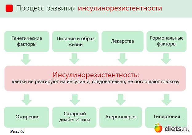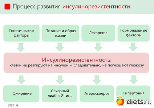 Ключевым моментом в развитии эндокринно-метаболических факторов риска и возраст-ассоциированных заболеваний лежит инсулинорезистентность (рис.6) [7].