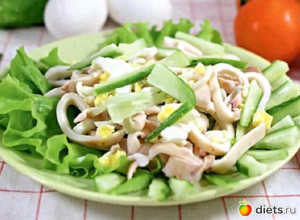 1. Кальмары очистить и отварить в течении 3 минут, затем немного охладить и нарезать тонкими колечками.