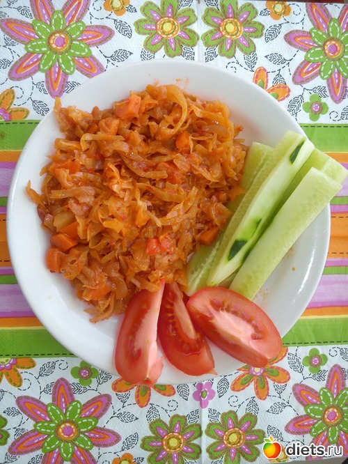 Обед – капуста тушеная (с овощами - морковь, лук, перец, кабачок). Очень вкусно, обожаю капусту тушеную, готова кастрюлями кушать. Огурчик, помидор – на фото по половине, т.к. другие половины скушала, когда резала. На десерт – банан.
