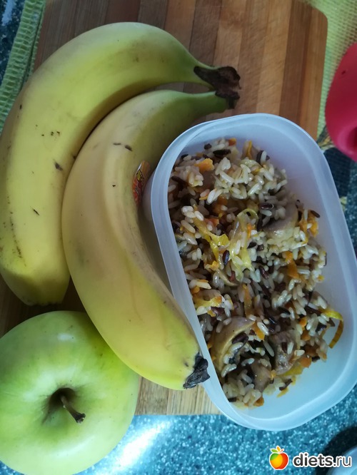 Всем приветик. Я к вам с отчётом, как то с ним, думаю будет проще, дабы косячить будет стыдно. Завтрак:два банана, кофе. Позже слопают яблоко. Обед:рис, обычный, бурый, овощи, грибы, свежий огурец. Ужин:тот же.