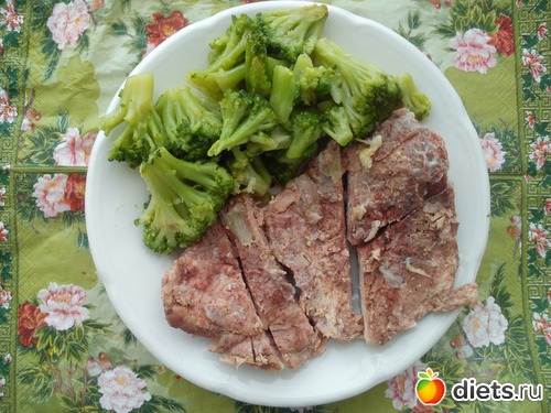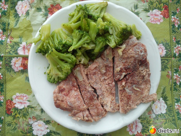 Ужин - свиная отбивная (маленький кусочек, примерно треть от обеденного), брокколи отварная -остатки (чуть-чуть), салат из помидоров и красного лука.