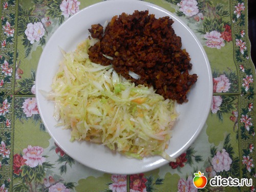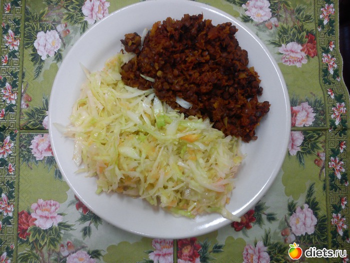 Обед – карри из чечевицы и тыквы, салат из капусты с морковкой и красным луком. На фото совсем ничего не видно, не понятно – куча какая-то темная)))). Но в действительности чечевица просто обалденная, я с таким удовольствием давно не кушала. Вкуснятина неописуемая.