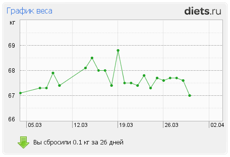 - вес 67,0 кг (еще надо скинуть 7,1 кг); за неделю 67-67,8=-0,8