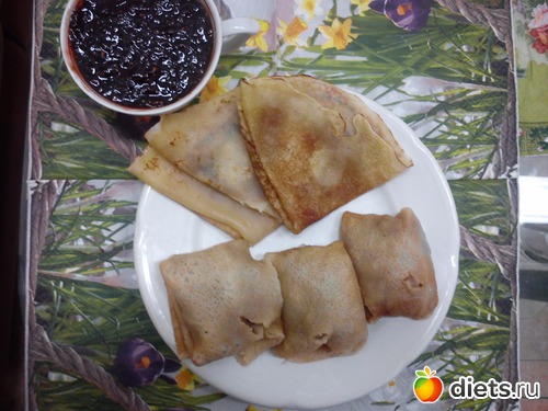 Обед - блинчики постные с грибами, с вареньем малиновым (2 чайные ложки, не больше).