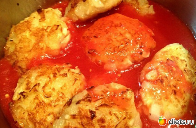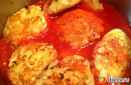 5. Сложи котлетки в толстостенную кастрюлю и залей томатным соком.