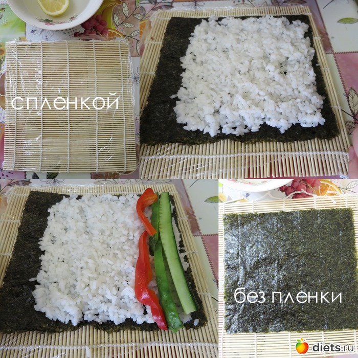 Начала собственно лепить) сначала я на циновку одела пищевую пленку, как мне мамуська ( Женя ) наша посоветовала, но ролл слишком к ней прилипал...и я ее убрала и просто скручивала на самом коврике... Кстати еще нашла рецепт, где девушка фильтрованную воду в тарелку наливает и добавляет туда ломтик лимона, это нужно для того, чтобы работать с рисом, распределять его. Воообщем я так же делала... А когда резала саму колбаску, то ножик в этой лимонной водичке тоже смачивала.
