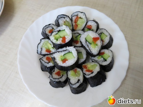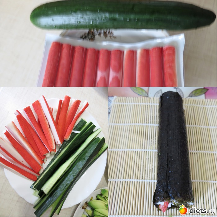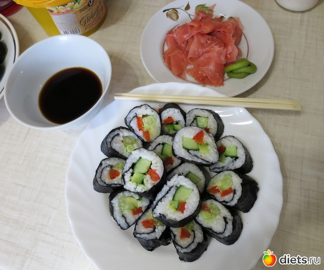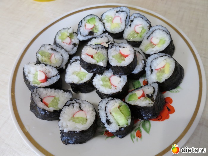Обед и ужин роллы ( делала разные, мужу с огурцом и крабовыми палочками;себе - с авокадо, сладким перчиком и огурцом)