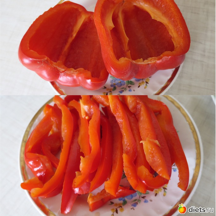 Перец красный кинула на 4 минуты в кипящую воду, чтобы размягчился и порезала соломкой