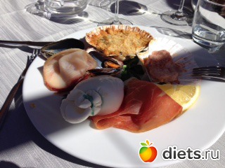 Закуска - ассорти из морепродуктов, с дополнительным прошутто (сыровяленое мясо) и бурратой (такой сыр, типа моцареллы, внутри жиденькие сливки). Я правда мяса не ем, поэтому свою ветчину отдала.