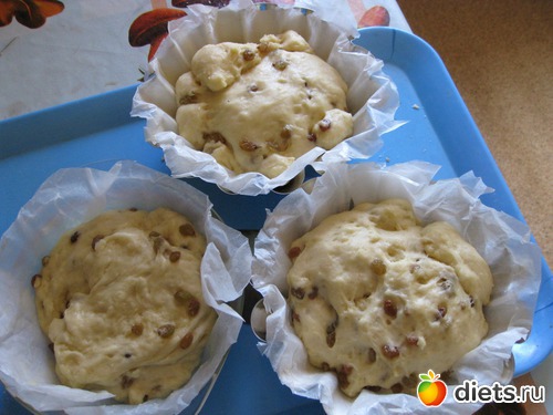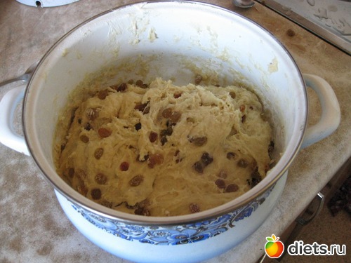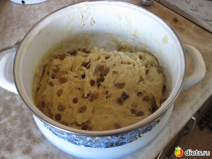 В поднявшееся тесто добавить изюм (без воды), вымесить и поставить еще на 1 час в теплое место под влажное полотенце.