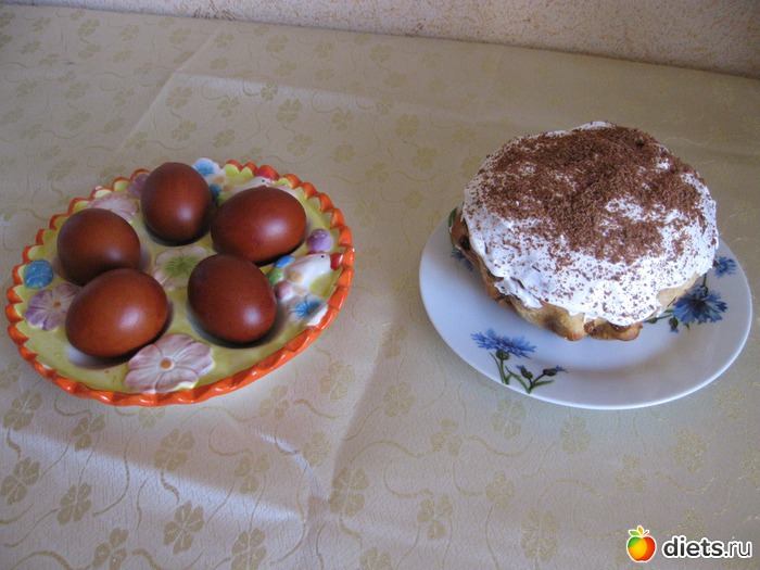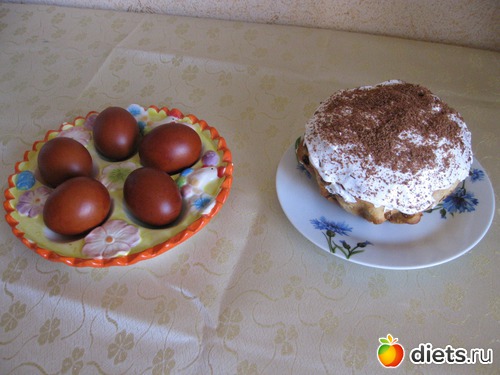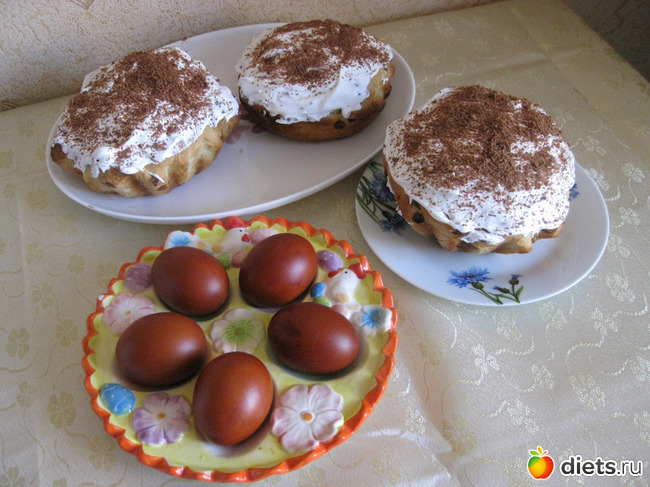 Готовый кулич смазать гоголем-моголем и посыпать шоколадом.