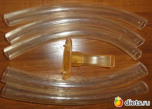 Тренажер «MIRON-01», который представлен на Рис.1, состоит из мягкого загубника и пяти отдельных мягких ПВХ трубок с номинальными внутренними диаметрами 14 мм. (3 шт.) и 16 мм. (2 шт.) длиной 210 ± 5 мм., которые при дыхательных тренировках соединяются между собой последовательно.