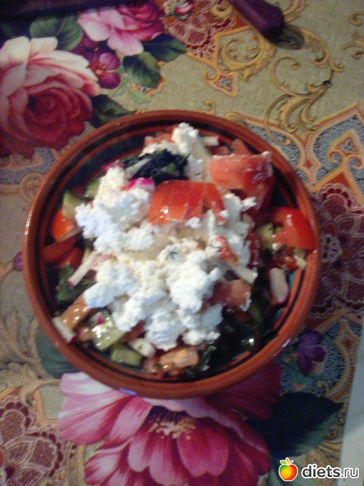 У салат из огурца, помидора, редиса и зелени с творогом и раст. Маслом. Но почему то сушит опиваюсь. Загадка...