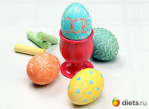 Когда-то давно купила специальные восковые мелки, там яйцо сначала отварить, потом пока горячее разрисовать, и только потом - в краску..