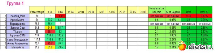 Первая группа, которая худеет без спорт полегчала за эту неделю на 11.4 кг (что по 1,425 кг на каждого).