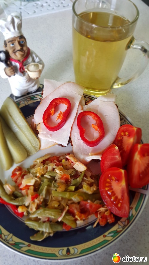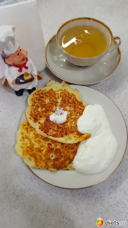 Это сырники по ДД,вкусные.И творожок 0% вместо сметанки.И мой любимый зелёный чай.