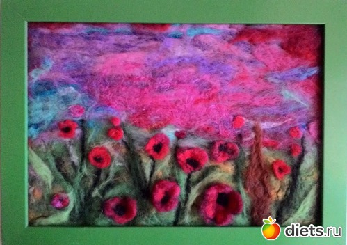 Мне нравится только то, что это рисунок объемный в отличие от шерстяной акварели, и цветы я не приваляла намертво, они как бы свободно держатся на стебле и под стекло это не спрячешь, хотя можно попробовать, чтобы не пылилось. Когда доведу до ума, тогда и поэкспериментирую.