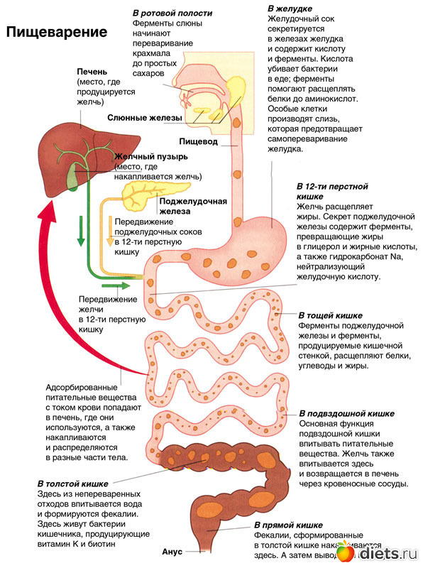 Слизистая по всей площади кишечника состоит из тонких, пальцеобразных ворсинок, с помощью которых происходит всасывание пищи. Общая длина кишечника около 6 м. В нем раздробленная в желудке пища расщепляется и всасывается в виде жиров, белков и углеводов.