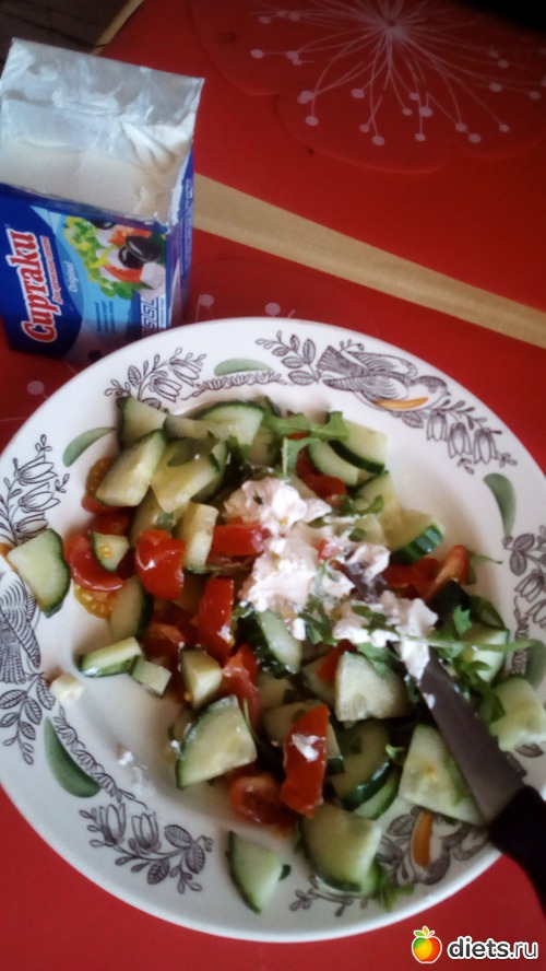 У меня сегодня рыбный день - рыбный супчик с перловкой из трески, я сварила треску, 2 кусочка порезала помельче и оставила в супе, а большие куски просто посыпала укропом - это второе, и гарнир ко второму - овощной салатик!