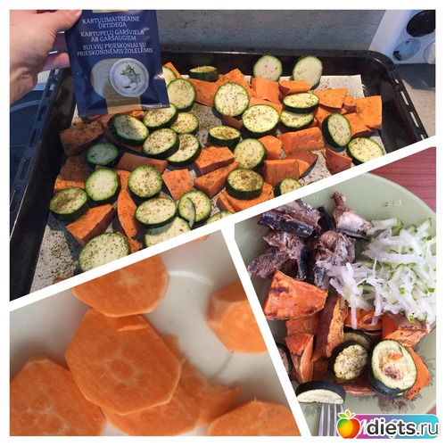 Решила не выеживаться и запечь в чистую) добавила цукини и посыпала травками))) Пока это все запекалось - съела сырые кусочки и поняла, что еле дождусь пока запечется)))) это нереально вкусно! какая же я была дурочка, что не купила батат раньше!!!!