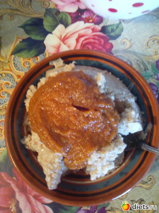 О каша пшеничная с луком жареным и кабачковой икрой.