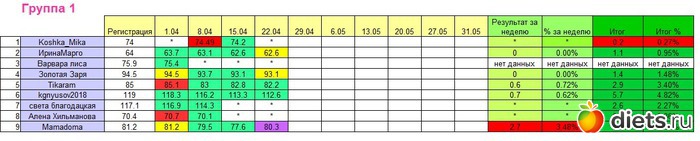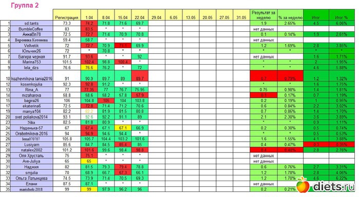 В таблице зелёный цвет значит потерю кг, красный - набор, жёлтый - без изменений.