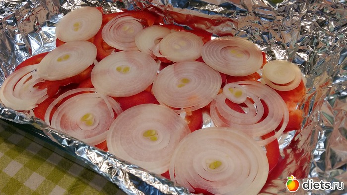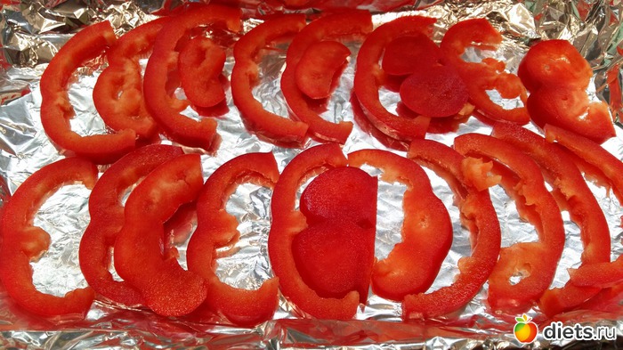 Рыбка маринуется, а я в это время нарезаю один болгарский перец и укладываю на фольгу в форме для запекания