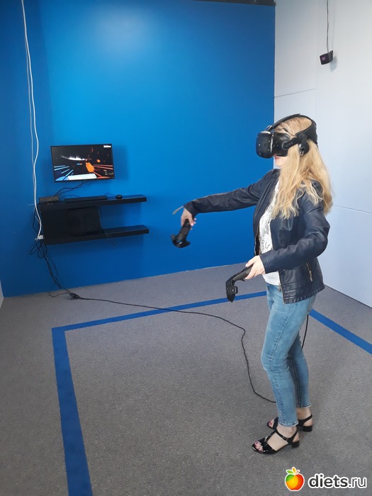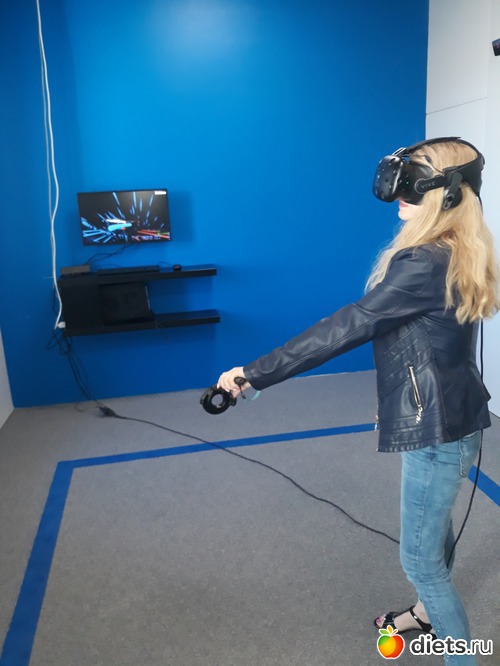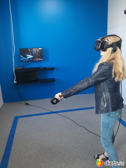 Это такая комната где можно побыть в виртуальном мире, в разных ситуациях по выбору, даже и под водой, на лифте поехать на крышу небоскреба и идти по узенькой доске на высоте (пока не свалишься), летать как супергерой и тушить пожары, нестись с горы на лыжах с препятствиями, пострелять зомбей и многое другое. Мы были там 2 часа всей компанией и всё конечно не успели перепробовать, но я под впечатлением, нереальный выброс адреналина. Потом попросила сфоткать меня возле цветущей яблони.